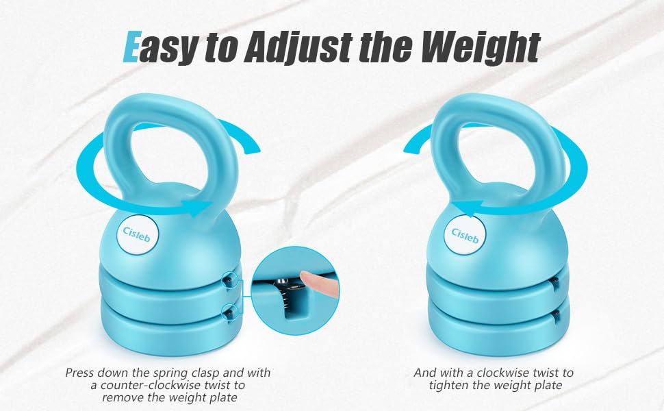 • This adjustable kettlebell makes it simple to switch weights effortlessly. Just press the spring clasp and twist the handle counter-clockwise to adjust the weight from 12 pounds to 8 pounds to 5 pounds.