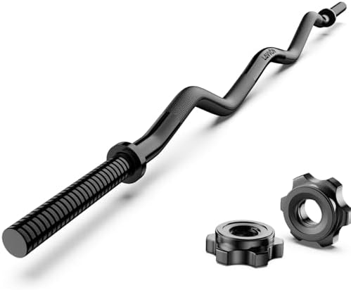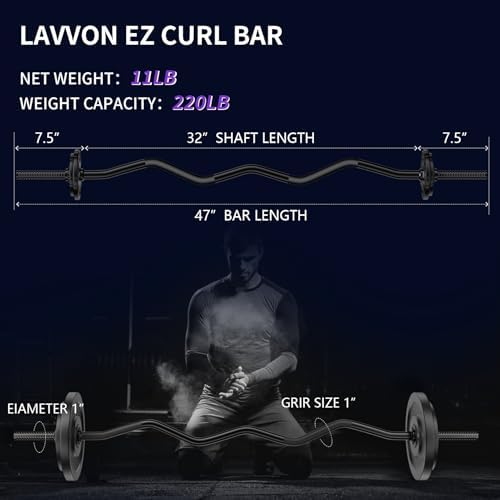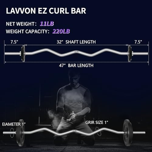 The Olympic EZ bar is 47 inches long and compatible with 2” Olympic boards. High-quality, heavy-duty solid steel ensures high load-bearing capacity and flexibility, supporting up to 220lbs.
