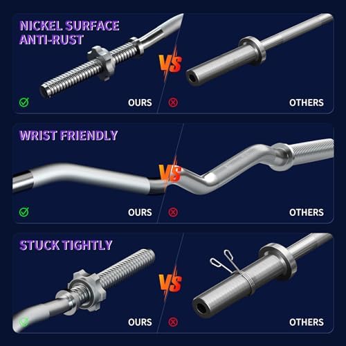 Our steel rods feature hardened nickel plating, providing resistance to corrosion and oxidation. Each bar comes with two anti-slip swivel steel clamps that secure 1” weight plates.