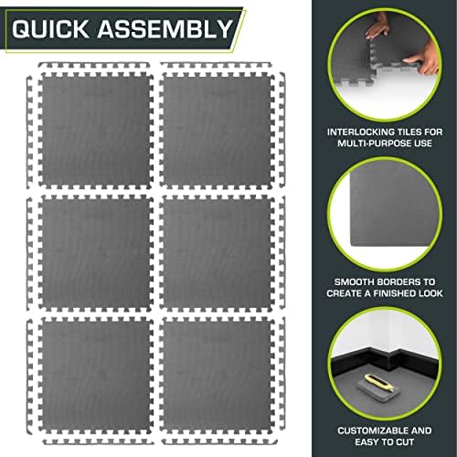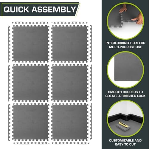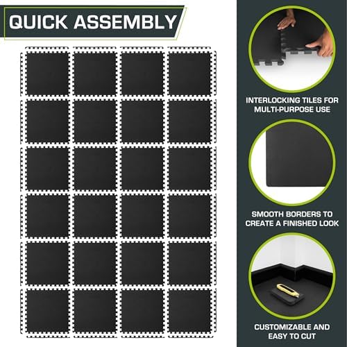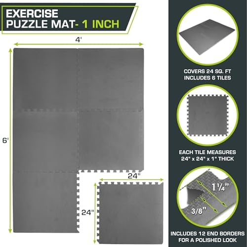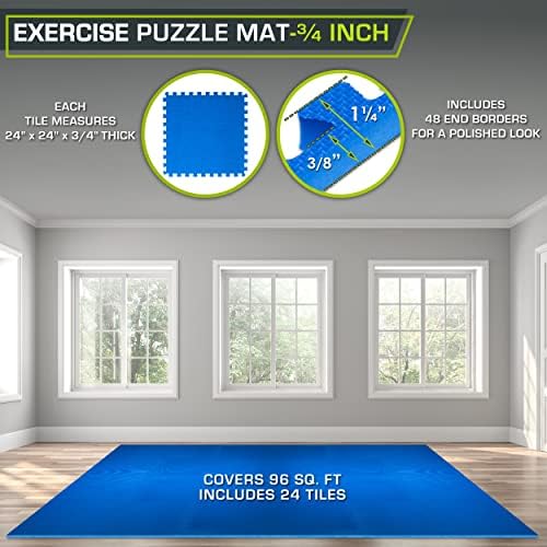 – 24” x 24” x 3/4”: Choose between a pack of 6 tiles covering 24 square feet or 24 tiles covering 96 square feet.