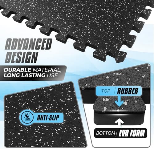RUBBER TOP Layer FOR DURABLE PROTECTION: This premium workout gym mat features a rubber top layer and high-density EVA foam on the bottom. Crafted for long-lasting protection, the quality rubber reduces odors over time. It effectively guards your garage or gym floor from scratches and dents.
