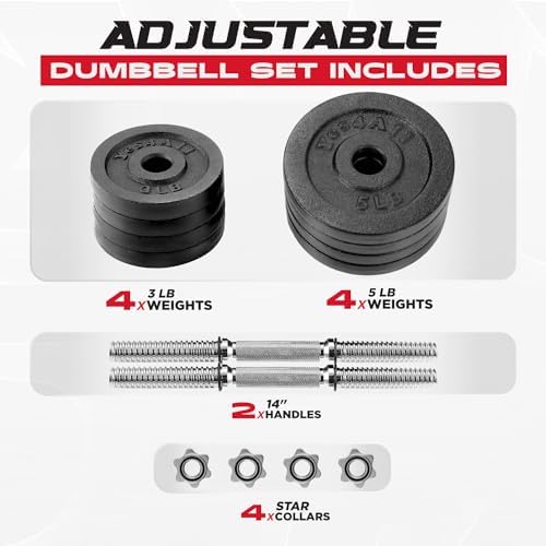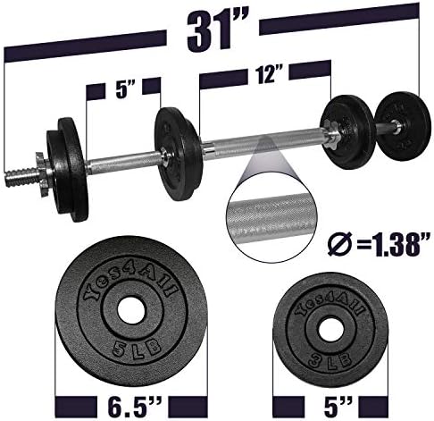 - Weight Set: 60 pounds total (two 14″ x 1″ handles, four 5-pound plates, four 8-pound plates)