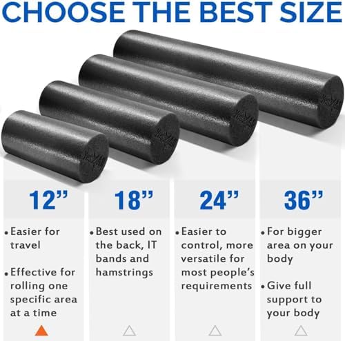 Versatile and Portable: Available in various colors and lengths (12″, 18″, 24″, 36″), this foam roller fits your preferred exercise routines effortlessly. Bring it along wherever you go, whether to the park, office, or home.